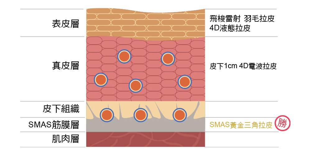 • SMAS筋膜層(Superficial Musculo-Aponeurotic System):關鍵提拉結構,透過深層調整可達長效拉提。