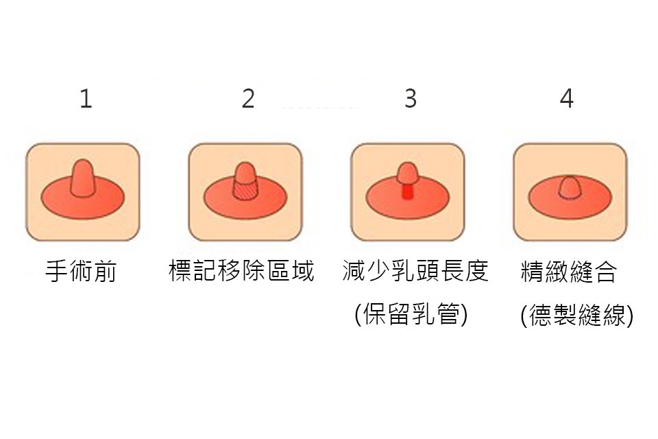 女性胸部的乳頭可能因哺乳後而過長下垂需要矯正,本院手術的原則為保留原本的乳管通暢性為主,縮減乳頭的直徑及長度,使外型恢復年輕時的風貌;至於乳暈的縮小亦需要將切口隱藏才能達到美觀的有效比例