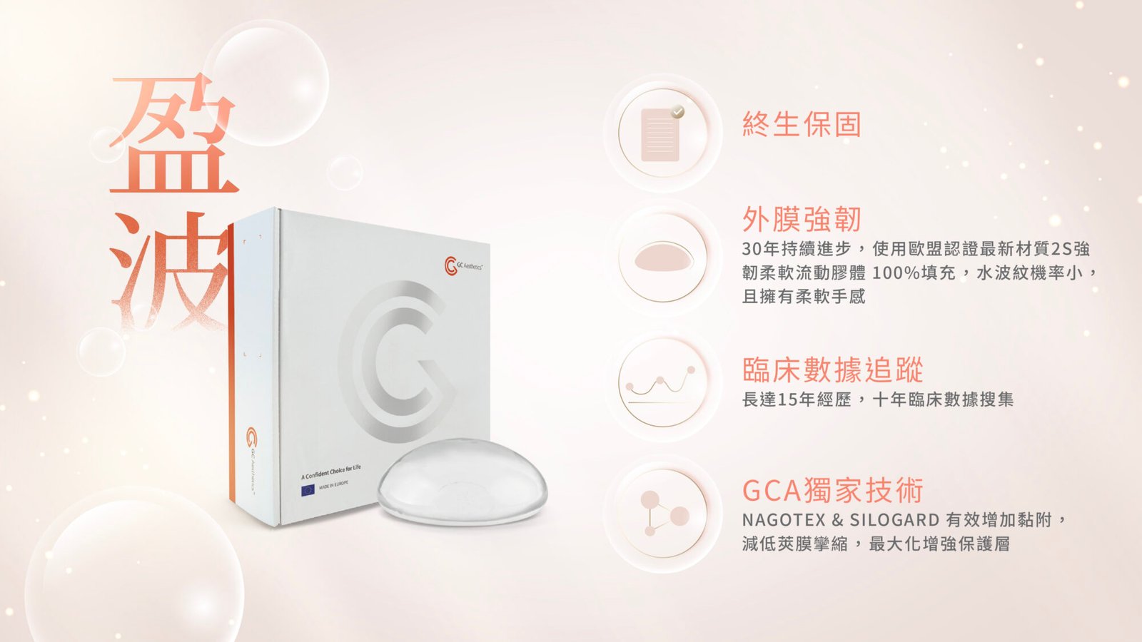 來自英國醫材大廠GCA®生產,CGA®是結合知名公司Nagor 和Eurosilicone 所創建,是生產義乳的重要品牌,而旗下「膾炙人口」的PERLET™珍珠波,以其獨特設計融入高科技的果凍矽膠假體聞名。