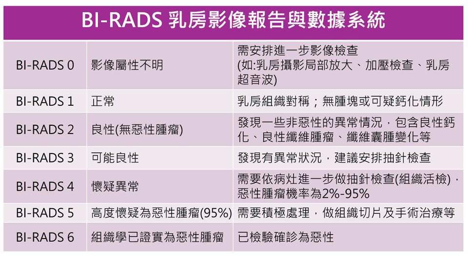 - 表示有可能是惡性,建議需要進行組織生檢。又依懷疑程度由低到高分為4a,4b 及4c。