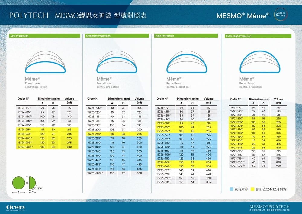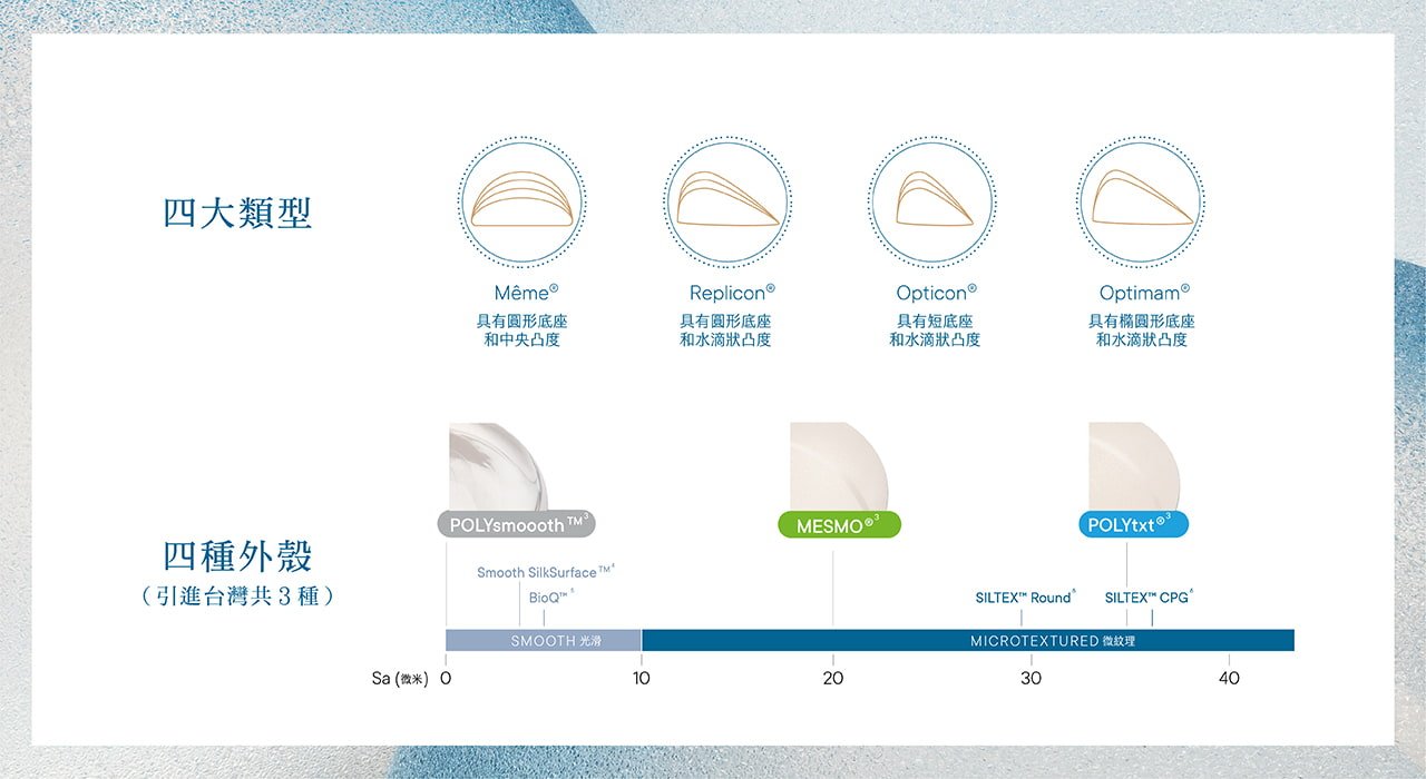 MESMO繆思女神波提供多樣化的尺寸與形狀選擇,整體可分為四大類型:Même®圓形底座中央凸度、Replicon®圓形底座水滴狀凸度、Optimam®橢圓形底座水滴狀凸度、Opticon®短底座水滴狀凸度。POLYTECH 系列共提供 4 種表面外殼、4 種高度、3 種植入型態、2 種植體形狀,可依個人胸型需求與醫師建議量身選擇,打造最貼合自身條件的自然曲線。