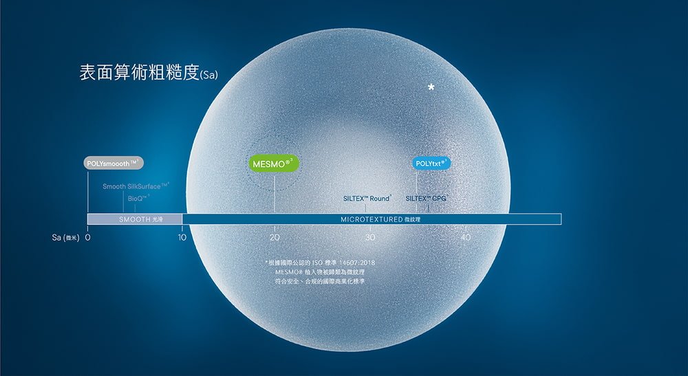 MESMO繆思女神波採用 20 微米(um)黃金比例的柔細微紋理表面,介於光滑面與粗糙面之間,不僅提升與組織的貼合度,也大幅提升相容性,因此術後無需進行按摩即可穩定成形。其植入物外型設計類似饅頭,一側圓潤、一側平整,有助減少位移與下垂風險,進一步提升穩定性與自然曲線。