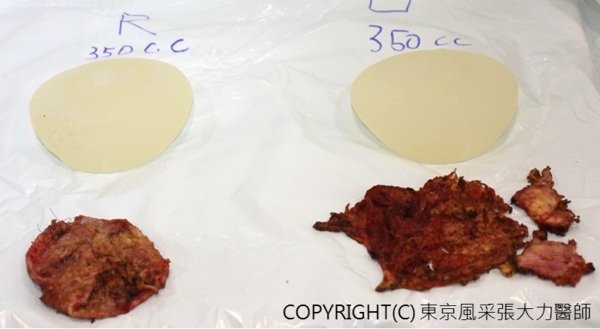 圖說:手術取出的絨毛面矽膠,雖然還是完整的外型,但表面上的特殊顆粒,因跟身體組織密合,在取出義乳的同時,顆粒組織已經脫落。
