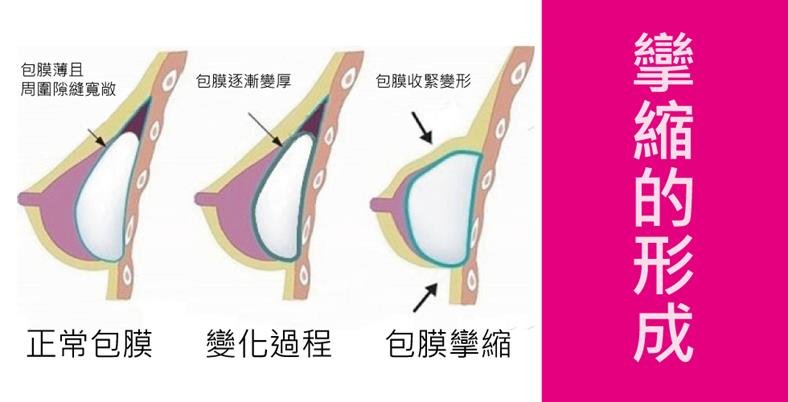 當手術植入外來物時,人體會產生自我保護的正常免疫反應,膠原纖維緊密編織形成包膜,稱作莢膜,假體隆乳透過手術植入果凍矽膠、水滴果凍矽膠、鹽水袋等植入物,因此隆乳術後都有不同程度的莢膜產生,但最令人擔心的隆乳術後莢膜攣縮,是指當膠原纖維包膜持續縮小,甚至收緊、壓縮到隆乳植入物,產生乳房觸感變硬、疼痛、甚至乳房外形改變等症狀,這是一種隆乳術後併發症,稱為莢膜攣縮(capsular contracture)。