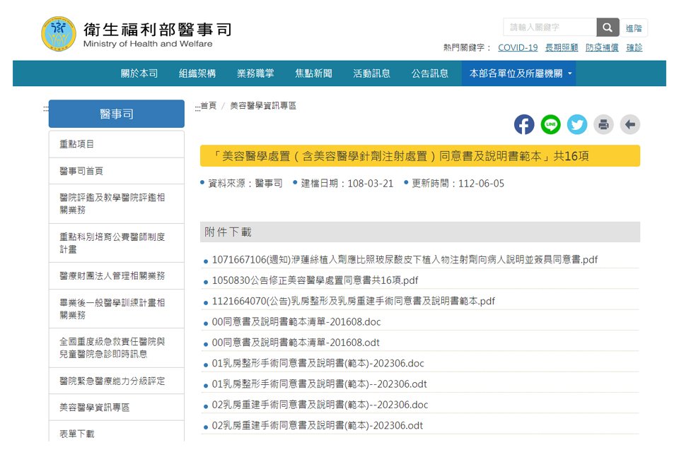 衛福部重視醫療品質,執行公告透過「美容醫學處置」同意書及說明書範本(請點我),增列思考期。醫療本身存有不確定因素,美容醫學屬於醫療行為,同意書說明併發症及後遺症發生機率及處理方法,風險與副作用等,參考國際相關指引與推行現況,導入行動衛教室機制,線上指導實證基礎,術後專業照護衛教及自我了解與照護,發展檢視自身條件與降低發炎感染出血等風險,多元組合式照護措施,線上推廣相關線上工具與雲端資料,在每個階段能建立有效的管理,將預防手術部位感染照護措施納入常規流程,以提升醫療照護品質,在術前、術中、術後的層層安全把關、共同合作管理,目的在於降低術後傷口的疼痛、腫脹,預防發炎、感染等併發症機率,縮短恢復期,改善體內細胞的發炎與不良狀態。個案管理中的繁雜步驟,主要在發炎和免疫力低下等不良因素,醫療行為,每個人的狀態都不一樣,衛福部在同意書傳達的內容公告於衛福部網站,增進民眾於術前完整的了解與判斷。